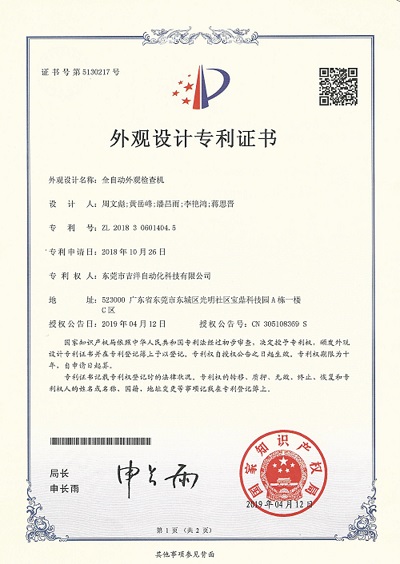 近日,易倍体育 与东莞市吉洋自动化科技有限公司共同设计研制成功的吉洋光学检测设备产品,成功申请了三项外观设计专利:全自动外观检查机、全自动光学检测设备(顶部镜头在线式)、全自动光学检测设备(底部镜头在线式)。